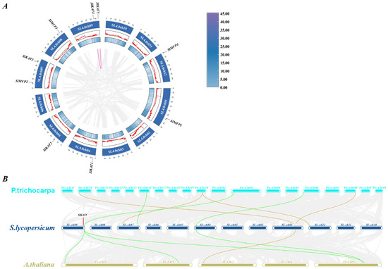 Figure 8. Gene duplication and collinearity analysis of KAT and MFP genes. (A) Covariance analysis of SlKATs with SlMFPs. The blue bars represent chromosomes, the gray lines represent all co-lined genes in tomato, and the pink lines indicate KAT and MFP co-lined genes. The color scale represents the fold change normalized by the log2-transformed data. (B) Covariance of P. tomentosa, tomato, and A. thaliana genes. Yellow lines indicate KAT genes and green lines indicate MFP genes. Gray lines in the background indicate collinear blocks within the P. tomentosa, tomato, and A. thaliana genes.