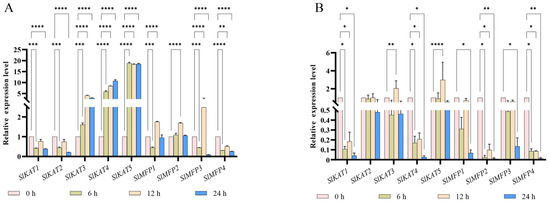 Figure 10. Expression levels of SlKAT and SlMFP genes under ABA (A) and MeJA (B). The asterisk (*) indicates that the expression level of the stress group is significantly different from that of the control group (* p < 0.05, ** p < 0.01, *** p < 0.001, and **** p < 0.0001, one-way ANOVA, Tukey test). The samples in the 0 h treatment were used as controls.