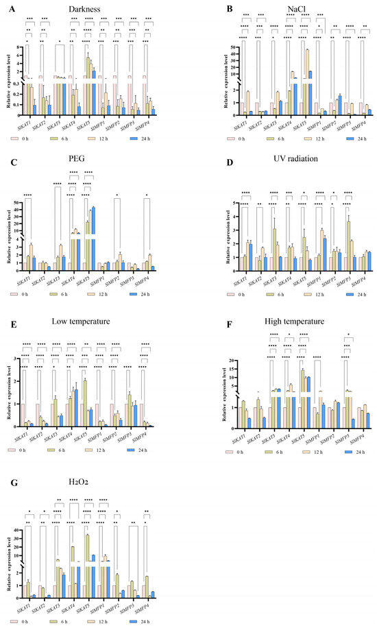 Figure 11. Darkness (A), NaCl (B), PEG (C), UV radiation (D), low-temperature (E), high-temperature (F), and H2O2 (G) treatments. The asterisk (*) indicates the corresponding gene that was significantly up- or down-regulated compared with the 0 h status (* p < 0.05, ** p < 0.01, *** p < 0.001, and **** p < 0.0001, one-way ANOVA, Tukey test). The samples in the 0 h treatment were used as controls.