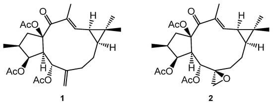 - Zhan, Z.; Li, S.; Chu, W.; Yin, S. Euphorbia Diterpenoids: Isolation, Structure, Bioactivity, Biosynthesis, and Synthesis (2013–2021). Nat. Prod. Rep. 2022, 39, 2132–2174. [Google Scholar] [CrossRef] [PubMed]