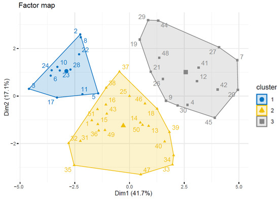 Location of clusters with test results in Dim1, Dim2 space (values within clusters indicate the ID of patients in the test group). The size of the 1, 2, and 3 clusters was n1 = 12, n2 = 23, and n3 = 16 individuals, respectively. Dim—two-dimensional space.