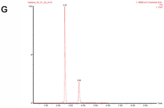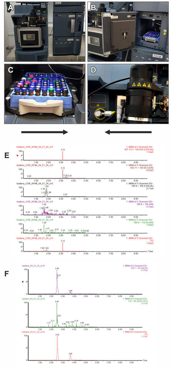 LC-ESI-MS/MS chromatograph and the results of metabolites determination collected by multiple reaction monitoring (MRM) mode. (A) Waters ACQUITY UPLC®H-Class set – liquid chromatograph with mass detector; (B) view of an open autosampler; (C) sample tray in the autosampler; (D) replaceable head for electrospray analysis (ESI) in an electric field; (E) chromatogram showing peaks for cortisol (COR) and kynureninic acid (KA) and their deuterine derivatives, the lowest chromatogram shows TIC (Total Ion Current) for the tested sample; (F) chromatogram for glutamine (GLN), deuterium derivative of glutamate (GLUT) and TIC for the entire sample; (G) TIC of the entire analyzed sample—the equivalent of a classic chromatogram.