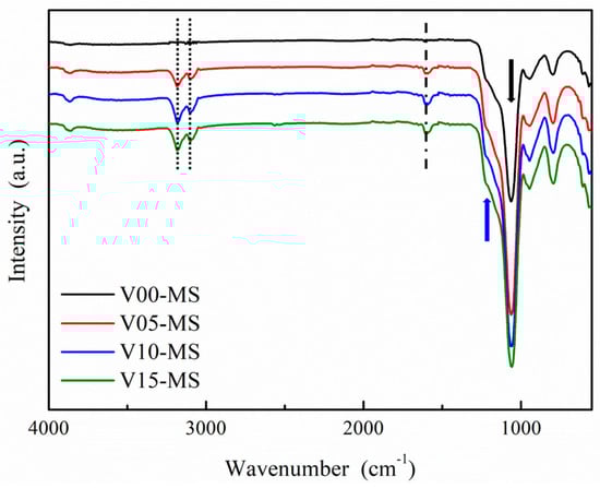 The FTIR analysis results of mesoporous silica nanoparticles incorporating vinyl groups (V-MS) are shown in Figure 4. Symmetric and asymmetric stretching vibrations of Si-O-Si are observed at 1057 cm−1 (the black arrow in Figure 4) and 1215 cm−1 (the blue arrow in Figure 4), respectively []. For the signal of vinyl group, a peak corresponding to the C=C double bond is detected at 1596 cm−1 (dashed line in Figure 4), and C-H peaks associated with the C=C double bond are observed at 3097 cm−1 and 3181 cm−1 (dotted line in Figure 4) []. In V00-MS, there is no observable peak associated with vinyl groups. It can be noted that as the VTMS content increases, the peaks related to vinyl groups also increase. Nevertheless, when comparing V10-MS and V15-MS, the peaks associated with vinyl groups are nearly identical, suggesting that there may be a limit to the extent of vinyl group incorporation. These results indicate that vinyl groups have been successfully introduced into mesoporous silica.
