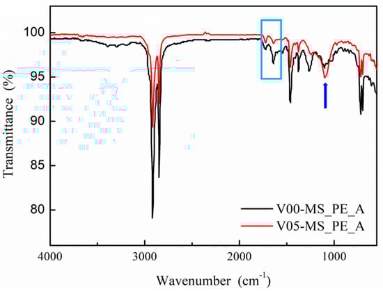 In Figure 5, the FTIR graph of recycled PE containing mesoporous silica is presented. The typical polyethylene FTIR peaks are similar, but the presence of synthesized mesoporous silica is confirmed by the Si-O-Si peak at 1100 cm−1 (the blue arrow in Figure 5). Notably, attention should be given to the stretching peak of C=C double bonds at 1640 cm−1 (the blue rectangular area in Figure 5). The peak for V05-MS_PE_A, which includes vinyl functional groups, significantly decreases compared to the peak for V00-MS_PE_A, which does not contain vinyl groups. This suggests that the functional groups of vinyl in mesoporous silica induce bonding between vinyl groups in recycled PE, leading to a decrease in the peak intensity.