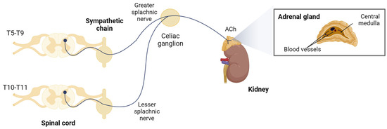 Sympathoadrenal system. Chromaffin cells are innervated by sympathetic preganglionic fibers of the splanchnic nerve. Created with BioRender.com, accessed on 17 January 2024.