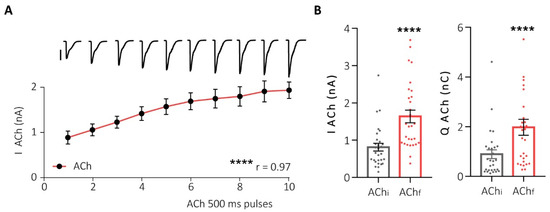 Successive pulses of ACh increase the nAChR-elicited current. (A) Representation of the increase in nicotinic current peak in HCCs after 10 ACh pulses of 500 ms/90 s. At the top, representative original recordings of each pulse (500 pA scale). (B) Dot plots of the peak (left panel) and charge (right panel) of the initial (AChi) and final (AChf) ACh pulses in this protocol (potentiation protocol). **** p < 0.0001. Taken from Jiménez-Pompa and colleagues [62].