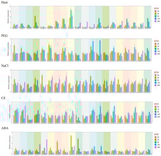 2.7. Expression Analysis of AsHSP90s in Oats under Five Abiotic Stresses
