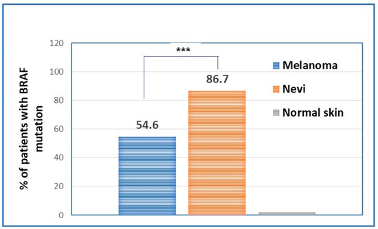 - Chiappetta, C.; Proietti, I.; Soccodato, V.; Puggioni, C.; Zaralli, R.; Pacini, L.; Porta, N.; Skroza, N.; Petrozza, V.; Potenza, C.; et al. BRAF and NRAS mutations are heterogeneous and not mutually exclusive in nodular melanoma. Appl. Immunohistochem. Mol. Morphol. 2015, 23, 172–177. [Google Scholar] [CrossRef]