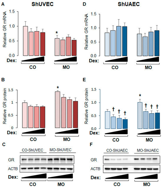 Maternal obesity upregulates GR protein expression in fetal umbilical vein and artery endothelial cells. Confluent and quiescent cells were treated with various doses of dexamethasone (0.04, 0.2, and 1 µM) for 24h and then analyzed for GR expression as described in the Section 4. (A) ShUVEC GR mRNA levels, (B) ShUVEC GR protein levels, (C) representative immunoblots for ShUVEC GR and ACTB, (D) ShUAEC GR mRNA levels, (E) ShUAEC GR protein levels, and (F) representative immunoblots for ShUAEC GR and ACTB. Bar graphs represent the mean ± SEM for each group (n = 5–6 lambs/diet group). * p < 0.05 control (CO) vs. obesogenic (MO) diet; † p < 0.05 basal vs. dexamethasone.