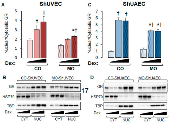 We then investigated nuclear-to-cytosolic GR ratios in basal and dexamethasone-stimulated cells as only nuclear GR can act as a transcription factor. MO decreased nuclear/cytosolic GR ratios in MO ShUVECs by 45% in solvent-, 52% in dexamethasone low-dose-, and 68% in dexamethasone high-dose-treated cells (Figure 4A,B). Dexamethasone at low and high concentrations increased GR nuclear/cytosolic ratios in CO-ShUVECs, while only high-dose dexamethasone increased nuclear GR in MO-ShUVECs (Figure 4A,B). Importantly, the GR nuclear/cytosolic ratios in ShUVECs were correlated with GRE-mediated transactivation of a luciferase reporter (Figure 3A and Figure 4A,B). In contrast, the MO diet did not affect basal GR nuclear translocation but decreased dexamethasone-induced nuclear translocation by 38–39% in ShUAECs (Figure 4B). Furthermore, dexamethasone-induced GR nuclear translocation in CO- and MO-ShUAECs was higher in ShUAECs compared with ShUVECs (6-fold increase in CO-ShUAECs, 3-fold increase in MO-ShUAECs, 2-fold increase in CO-ShUVECs, and 1.75-fold increase in MO-ShUVECs; Figure 4A–D). Interestingly, the dexamethasone-induced increases in GR nuclear translocation in ShUAECs did not result in increased GRE-transcriptional activation as shown by luciferase assays (Figure 4C,D vs. Figure 3B), suggesting additional nuclear inhibitors of GR function in ShUAECs.