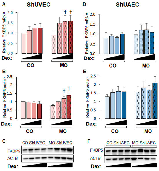 Maternal obesity increases dexamethasone sensitivity to FKBP5 upregulation in ShUVECs. Confluent and quiescent ShUVECs and ShUAECs were treated with various doses of dexamethasone (0.04, 0.2, and 1 µM) for 24h and then analyzed for FKBP5 expression as described in the Section 4. (A) ShUVEC FKBP5 mRNA levels, (B) ShUVEC FKBP5 protein levels, (C) representative immunoblots for ShUVEC FKBP5 and ACTB, (D) ShUAEC FKBP5 mRNA levels, (E) ShUAEC FKBP5 protein levels, and (F) representative immunoblots for ShUAEC FKBP5 and ACTB. Bar graphs represent the mean ± SEM for each group (n = 5–6 lambs/diet group). p < 0.05 control (CO) vs. obesogenic (MO) diet, † p < 0.05 basal vs. dexamethasone.