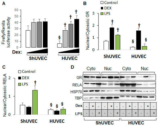 ShUVECs show decreased sensitivity to glucocorticoids compared with HUVECs. ShUVECs from control lambs of another sheep breed (Western Mix) were studied next to previously characterized dexamethasone-sensitive HUVECs. (A) GRE-dependent transactivation of a luciferase reporter vector is shown as relative Firefly/Renilla luciferase activity (n = 6 WM-ShUVECs, n = 12 HUVECs). (B) GR and (C) RELA nuclear translocation were studied by immunoblotting using HSP70 and TBP as control markers (D) (n = 4/group). † p < 0.05 basal vs. dexamethasone, § p < 0.05 WM-ShUVECs vs. HUVECs.