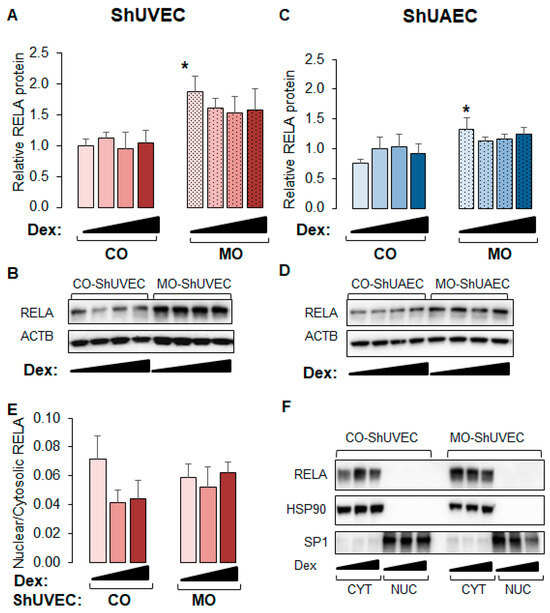 Because WM-ShUVECs showed higher basal and stimulated nuclear NF-kB RELA levels (Figure 6C), we investigated the effect of MO on total and nuclear RELA levels (Figure 7) in all four groups. We found that MO increased the basal levels of total p65 NF-kB in ShUVECs by 87% (Figure 7A,B) and ShUAECs by 76% (Figure 7C,D) without increasing nuclear translocation (Figure 7E,F). Indeed, more than 90% of RELA protein was localized in the cytosol of all samples (Figure 7E,F). Furthermore, dexamethasone did not have any effect on RELA expression or subcellular location, although there was a trend towards RELA downregulation in MO-derived cells (Figure 7A,C).