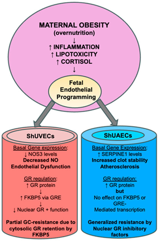 Summarized findings of MO effects on GR homeostasis and key endothelial gene expression. The current hypothesis is that MO-originated inflammatory lipid mediators induce epigenetic changes that lead to offspring endothelial dysfunction. In this MO model, fetal endothelial cells show partial to generalized glucocorticoid resistance that could be a species-specific protective mechanism against cortisol-mediated endothelial dysfunction.