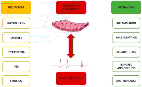Shared risk factors for atrial fibrillation and endothelial dysfunction (left). Key mechanisms induced by these risk factors, culminating in atrial fibrillation and endothelial dysfunction (right). Autonomic nervous system (ANS); renin–angiotensin–aldosterone system (RAAS). Parts of the figure were drawn using pictures from Servier Medical Art. Servier Medical Art by Servier is licensed under a Creative Commons Attribution 3.0 Unported License (https://creativecommons.org/licenses/by/3.0/, accessed on 8 February 2024).