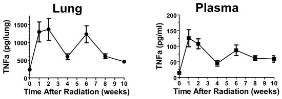 Effects of 14 Gy thoracic radiation on TNFα levels. Mice were exposed to 14 Gy thoracic radiation and then euthanized at the indicated times. TNFα levels in lung homogenates and plasma were determined by ELISA.