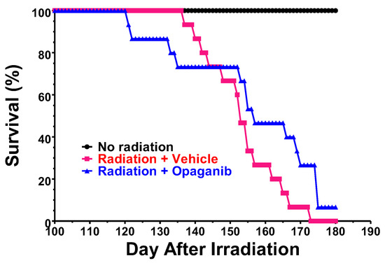 Because radiation-induced pulmonary fibrosis is mediated by excessive inflammation regulated by sphingolipids [16,17,18,19,20,21,22,23], we hypothesized that opaganib may decrease pulmonary damage from ionizing radiation. In previously reported work, we demonstrated that oral treatment of mice with opaganib 2 h before exposure to TBI, or IR with partial bone marrow shielding, provides substantial protection against GI-ARS associated with suppression of radiation-induced elevations of S1P and TNFα in the small intestines [34]. In the partially bone marrow shielded model, opaganib improved survival when administered 4 h before or 24 h after radiation exposure, and was particularly effective when given both prior to and following radiation [34]. In several mouse tumor models, the combination of opaganib with radiation provided the optimal suppression of tumor growth without increasing toxicity to the animals [34]. Overall, opaganib substantially protected normal tissue from radiation damage that may occur through unintended exposure or cancer radiotherapy.