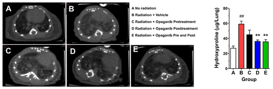 Immediately prior to euthanization on Day 180, the extent of lung damage was assessed using micro-CT imaging (Figure 3). The lung scans of mice receiving radiation but no drug treatment (Group B) were more opaque than control mice (Group A), reflecting the higher density of the fibrotic lung tissue in these animals. Pretreatment alone with opaganib (Group C) did not have an observable effect on lung density; however, treatment with multiple doses of opaganib between Days 14 and 24 (Groups D and E) substantially reduced the degree of lung damage assessed by imaging. Collagen levels in the lungs were estimated by measuring the amount of hydroxyproline in HCl-digested lung tissue. As shown in Figure 3, radiation exposure (Group B) markedly increased (p < 0.01) the amounts of hydroxyproline in the lungs at Day 180, compared with controls (Group A). Treatment with opaganib (Groups D and E) strongly reduced the levels of hydroxyproline in the lungs (p < 0.01) compared with radiation alone. In all, the data indicate that a single dose of opaganib prior to radiation provides some protection against the development of pulmonary fibrosis. However, the repeated use of opaganib during the initial inflammatory period after irradiation appears to provide the greatest reduction in the fibrotic cascade.