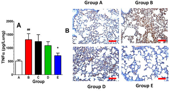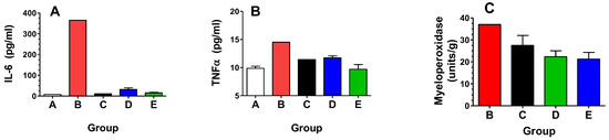 Surviving mice were euthanized on Day 180 for secondary endpoint analyses, yielding sample sizes of 5, 1, 1, 6, and 4 for Groups A, B, C, D, and E, respectively. After euthanasia, the left lung was fixed in formalin for histology, and the right lung was snap frozen for biochemical analyses. Unfixed lung samples were homogenized in PBS and centrifuged, and the supernatants were analyzed for expression of the key inflammatory cytokines IL-6 and TNFα. As shown in Figure 6A,B, levels of IL-6 and TNFα were elevated in the radiation + Vehicle group (Group B), as compared to unirradiated controls (Group A), indicating a prolonged inflammatory state in the lungs. All the opaganib treatment groups (Groups C, D and E) had markedly lower expression levels of IL-6 than did the radiation-alone group; however, a statistical comparison was not possible because of the small sample number. Lung levels of TNFα were only slightly elevated on Day 180, and were essentially equal to unirradiated mice in all the opaganib treatment groups. As a measure of granulocyte infiltration, myeloperoxidase (MPO) activity was also measured in the lungs of mice on Day 180. As shown in Figure 6C, MPO activity was also reduced in opaganib-treated mice compared with the irradiated + Vehicle group (Group B).