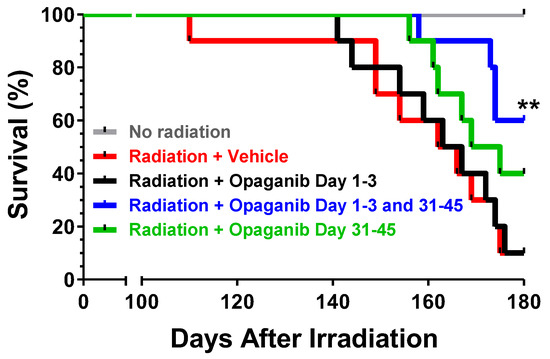 Effect of opaganib schedule following partially shielded radiation on survival. Male C57BL/6 mice were exposed to 0 (Group A) or 15.25 Gy radiation, and treated with: vehicle at all dosing times (Group B); 100 mg/kg opaganib twice-daily, beginning 24 h after irradiation, for 3 days only (Group C); 100 mg/kg opaganib twice-daily, beginning 24 h after irradiation for 3 days, and then again once daily with 100 mg/kg opaganib on Day 31-45 (Group D), or 100 mg/kg opaganib once daily on Day 31-45 only (Group E). Mice were monitored daily and euthanized according to the IACUC-approved protocol. ** p < 0.01 vs. Radiation + Vehicle (Group B).