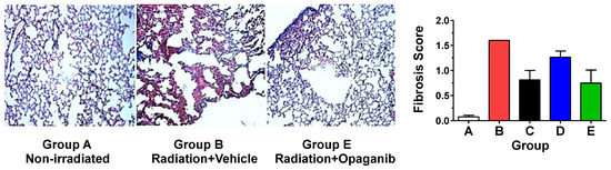 The formalin-fixed, paraffin-embedded lungs were sectioned and stained with Masson’s trichrome to visualize collagen deposition (Figure 7). Fibrosis was absent in unirradiated animals (Group A), present in the irradiated + Vehicle group (Group B), and reduced in opaganib-treated mice, as represented by a section from a mouse treated with opaganib on days 31–45 (Group E). Staining patterns were similarly reduced in tissue from mice treated on Day 1–3 and 31–45 (Group D). Additionally, the Fibrosis Score in the lung sections was determined in a blinded fashion by an external veterinary pathologist using the Ashcroft scale, scoring 10 non-overlapping 10x fields per mouse. As shown in Figure 7, there was very little fibrosis in sections from the unirradiated group (Group A). The irradiated + Vehicle group (Group B) had the highest fibrosis score, although this reached only a mild degree of fibrosis because mice were euthanized on Day 180. Nonetheless, treatment with opaganib in either the early inflammatory phase (Group C) or the delayed inflammatory phase (Group E) substantially reduced the average fibrosis score in the lungs of irradiated mice.