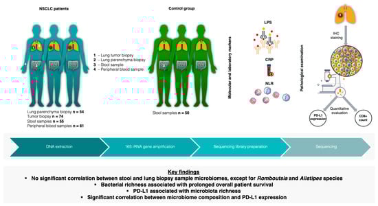 In this study, we performed a comprehensive analysis of the microbiome compositions of lung tumor and lung parenchyma tissues, alongside fecal samples obtained from individuals diagnosed with NSCLC. We aimed to determine the link between the bacterial compositions of NSCLC patients along the gut–lung axis in relation to clinical parameters, molecula r markers of systemic inflammation such as CRP (C-reactive protein), the NLR (neutrophil-to-lymphocyte ratio), LPS (lipopolysaccharide), CD8+ cells (cytotoxic T lymphocytes), and the expression levels of PD-L1 protein (Figure 1).