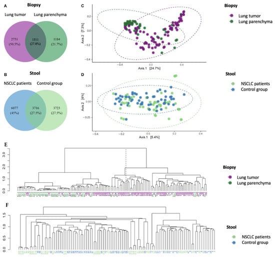 The bacterial compositions of lung biopsy and stool sample microbiomes of NSCLC and control group patients. The Venn diagrams indicate the numbers of group-specific amplicon sequence variants (ASVs) between lung tumor and lung parenchyma biopsy samples (A) and between NSCLC and control group stool samples (B). Principal coordinate analysis (PCoA) of biopsy (C) and stool samples (D). Ward.D2 hierarchical clustering of biopsy (E) and stool samples (F).