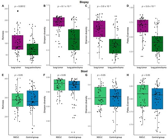 Lung biopsy and stool sample α-diversity comparison. Bacterial richness, Simpson’s diversity, Shannon’s diversity, and Pielou’s evenness diversity for biopsy (A–D) and stool (E–H) samples. p—the significance level.