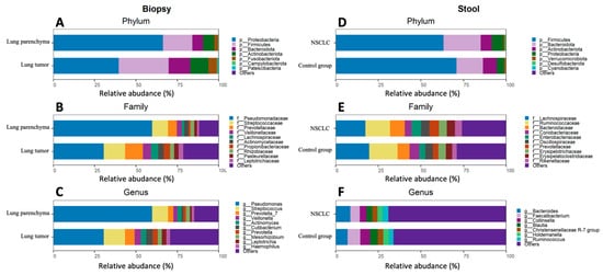 Lung biopsy and stool sample bacterial composition plots of NSCLC patients and control group. Relative abundance of the top 7 phyla, top 10 families, and top 10 genera for the biopsy (A–C) and stool (D–F) samples.