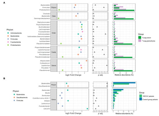 β-diversity analysis results. The left plots represent the log2-fold change values of the mean normalized abundance ratios between the comparison groups. The middle plots represent the p adj. values obtained after differential abundance analysis. The right plots represent the mean relative abundance values. This figure presents only those significantly different bacteria between comparison groups that accounted for at least 1% of the total number of taxa in at least one study group (the whole list of statistically significant results is presented in Supplementary Tables S2 and S3). (A)—biopsies; (B)—stool.