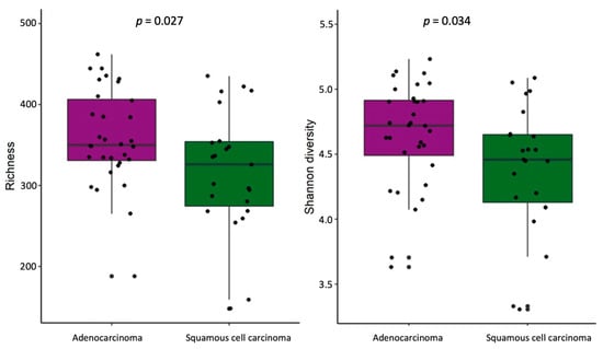 α-Diversity comparison according to histology type in NSCLC patients’ stool samples. The bacterial richness and Shannon’s diversity of NSCLC patients’ stool samples. p—the significance level.