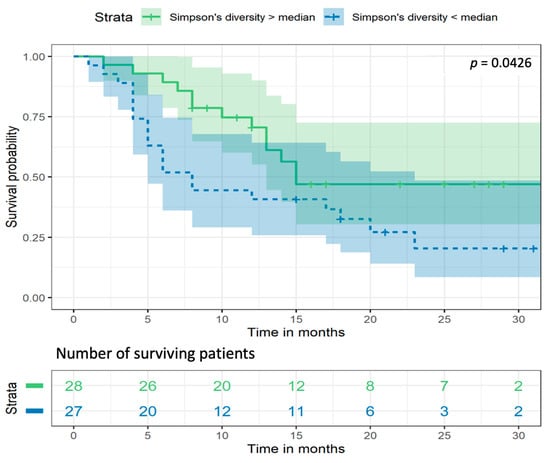 Survival analysis showed that NSCLC patients with Simpson’s diversity values (determined in stool samples) above the median had prolonged overall survival (OS) (p = 0.0426) (Figure 7). The Cox regression analysis hazard ratio (HR) was 2.06 (95% CI: 1.025–4.17), suggesting that NSCLC patients with lower bacterial diversity had significantly shorter OS. The median survival for a group of patients with higher bacterial diversity was 15 months, while for a group of patients with lower bacterial diversity, it was just over half as long, at 8 months. The largest differences in OS were observed in months 5 to 10. After 10 months from diagnosis, 71% (20 out of 28) of the patients with higher bacterial diversity were still alive, while in the group of patients with lower bacterial diversity, only 44% survived (12 out of 27 patients).