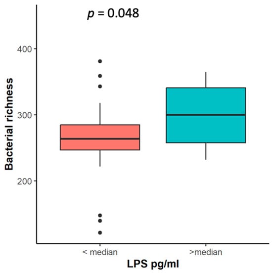 Bacterial richness in NSCLC patients’ stool samples according to LPS level. LPS—liposaccharide concentration (pg/mL), p—the significance level.