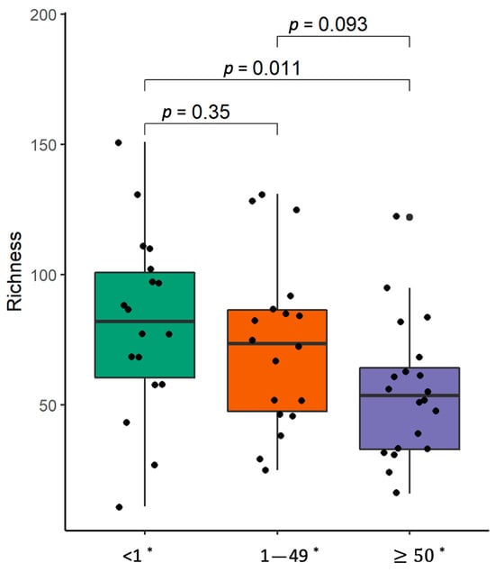 α-Diversity comparison according to PDL-1 expression level in non-small-cell carcinoma lung tissue samples. The bacterial richness of NSCLC patients’ samples. *—PD-L1 expression level, p—the significance level.