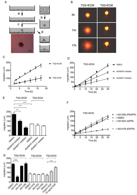 To study mesenchymal-epithelial cross-talk, we developed a 3D wound healing model where a multicellular, quiescent, fluorescently labelled keratinocyte spheroid is placed on a dermal-like 3D ECM, as outlined schematically (Figure 1A). We employed the N-tert1-immortalized keratinocyte cell line, which is fully competent to differentiate in organotypic cultures [37], to analyse re-epithelialisation responses to devitalized dermal-like ECM (Figure S1B) produced by TG2-positive (TG2+) or negative (TG2−) human fibroblasts [5]. Keratinocyte spheroid expansion was monitored using timelapse microscopy. TG2+ ECM supported rapid keratinocyte migration, whereas very little migration was evident on TG2− ECM (Figure 1B). Radial expansion of the keratinocyte spheroid was quantified using the algorithm, detailed in Supplementary Figure S1A, to avoid observer bias. Keratinocyte migration on TG2+ ECM was significantly increased (Figure 1C). We then investigated whether metalloproteinase activity was required for increased migration on TG2+ ECM, and showed partial inhibition by GM6001, TAPI-1 (Figure S1C), or ADAM10 inhibitor (Figure 1D). Only ADAM17 inhibition was effective in blocking migration on TG2+ ECM, reducing it to the level seen with TG2− ECM (Figure 1D). Comparison of keratinocyte migration on TG2+ ECM versus TG2− ECM in the presence and absence of ADAM inhibitor showed that only migration on TG2+ ECM was ADAM17 dependent. Migration on TG2− ECM was ADAM independent (Figure 1E). This indicates that TG2+ ECM activates ADAM17 in keratinocytes leading to enhanced motility. We hypothesized that this was likely linked to transactivation of EGFR. However, as insulin-like growth factor receptor (IGFR) modulates integrin-mediated motility [38] and a TG2–integrin complex promotes the platelet-derived growth factor receptor (PDGFR) signalling [39], we added specific kinase inhibitors to the medium to assess their contribution to keratinocyte migration. Only the EGFR inhibitor AG1478 was efficient at blocking keratinocyte migration on TG2+ ECM, while PDGFR and IGFR inhibitors were unable to block migration (Figure 1F,G, black bars). None of the kinase inhibitors affected migration on TG2− ECM (Figure 1G, white bars), but the addition of the EGFR-ligand, such as EGF, rescued impaired keratinocyte migration on TG2− ECM (Figure 1G, EGF addition, grey bars).