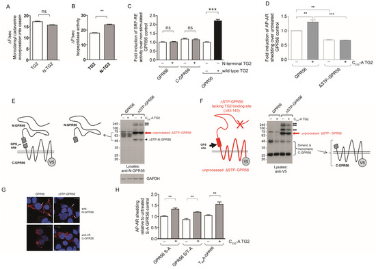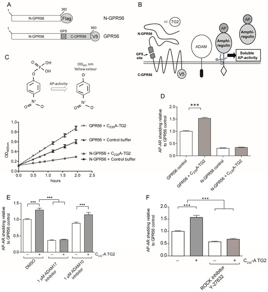 HEK293 cells were from Invitrogen, and cells were seeded into 24 well plates at 1 × 105 cells/well. The next day, 2 μg wild type or mutant GPR56-expression plasmids were mixed with 1 μg AP-AR-expression plasmid using 9 μL Fugene6 (E2691, Promega, Madison, WI, USA) and used to transfect four wells of a 24-well plate. Two days post transfection, the medium was removed, and cell monolayers were washed with serum-free advanced DMEM and serum starved for 1 h. GPR56 activation experiments were performed by incubating with 20 μg/mL C230-A TG2, TG2, N-TG2, 84 nM type III collagen or 5 μg/mL N-terminal GPR56 antibody (1 h). For inhibition studies with ADAM inhibitors, we treated cells with 1 µM inhibitors or DMSO control during serum starvation (1 h) and during the 1 h ligand stimulation, as indicated. Medium was cleared by centrifugation and AP-activity assayed, as described previously [62]. Each experiment was performed with 4 replicas per condition. 4-NPP hydrolysis rates were measured over time to ensure that the reaction was linear and that substrate depletion did not occur. The hydrolysis rates from individual experiments were then normalized by setting the values for the GPR56 buffer/DMSO control to one (Figure 3C,D). Data are the mean +/−s.e.m. from 3–5 independent experiments, as detailed in the figure legends.