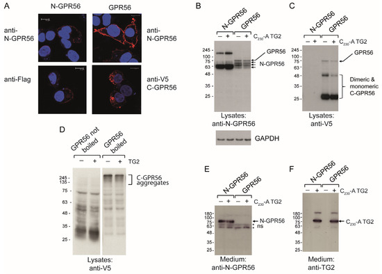 As receptor clustering might elicit a signalling response, we analysed cell lysates and medium from shedding experiments for evidence of TG2-dependent, intermolecular crosslinking of the N-terminal GPR56 domain involved in TG2 binding by Western blotting, both for cells expressing full length receptor or signalling incompetent N-GPR56. In lysates from GPR56-transfected cells, N-GPR56 antibody detected 4 distinct bands at 75, 70, 65, and 60 kDa (Figure 4B), in good agreement with previous reports [20,24]. C230-A TG2 treatment did not influence the banding pattern for N-GPR56, indicating the lack of intermolecular crosslinking, or these were below the detection limit (Figure 4B). Irrespective of C230A TG2 treatment, lysates from N-GPR56-transfected cells showed a strong broad 60–68 kDa band and a less abundant high molecular weight component at 180 kDa (Figure 4B). The latter band only occurred when using non-boiling conditions for SDS-PAGE, and hence does not represent a covalent crosslinking product. C-GPR56 fragments were only detectable using non-boiling SDS-PAGE conditions, as they formed aggregates when boiled (Figure 4D). Medium contained specific bands for N-GPR56 in N-GPR56-transfected cells only, indicating that the N-GPR56 domain remained cell-associated in full length GPR56-expressing cells (Figure 4E). Conditioned medium probed for TG2 showed staining in samples supplemented with C230-A TG2, with a major band at 80 kDa and minor bands at ~180 and 55 kDa (Figure 4F). The additional bands likely correspond to crosslinked TG2 dimers and a TG2 fragment lacking β-barrel domains. Therefore, while some autocatalytic crosslinking of TG2 was evident, intermolecular crosslinking of GPR56 alone or a TG2-GPR56 complex was not detected.