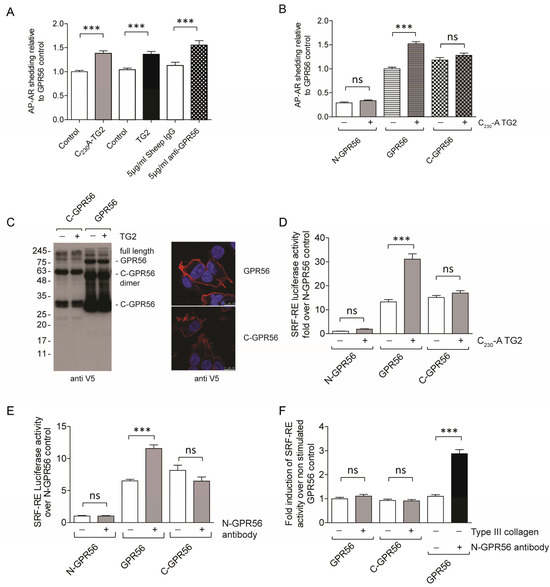 GPR56 activation by TG2 and anti-N-GPR56 antibody requires full length GPR56. (A) Comparison of C230-A TG2 (20 µg/mL), TG2 (20 µg/mL) and anti-N-GPR56 antibody (5 µg/mL) for their ability to activate full-length GPR56-dependent AP-AR shedding. (B) GPR56-dependent activation of shedding by TG2 requires intact GPR56. C-GPR56 is auto-active and not activated by TG2 (n = 3). (C) Western blot panel: Detection of the C-terminal GPR56 fragment in GPR56 and C-GPR56 expressing cells using the V5-epitope antibody. Confocal microscopy panel: Cell surface expression of GPR56 and C-GPR56 using anti-V5 antibody in red. Scale bar 10µm. (D) Luciferase reporter assay to assess TG2 dependent signalling in N-GPR56, GPR56, and C-GPR56-expressing cells. To determine Rho activation, cells were co-transfected with N-GPR56, GPR56, or C-GPR56 plasmid and SRF-RE luciferase reporter. After 48 h post-transfection, cells were stimulated with 20 µg/mL C230A TG2 for 6 h, and luciferase activity was determined in lysates. TG2 activated GPR56 dependent SRF-RE luciferase reporter activity, while C-GPR56 was not stimulated (n = 3). (E) N-GPR56 antibody (5 µg/mL) activates GPR56 dependent SRF-RE luciferase reporter activity. Neither N-GPR56 nor C-GPR56 was stimulated by N-GPR56 antibody treatment. Controls were treated with control sheep IgG (n = 3). (F) Type III collagen (83 nM) did not activate GPR56. N-GPR56 antibody was used as a positive control (n = 3). p values of <0.001 equals (***).
