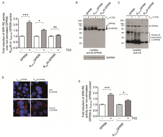 2.5. GPR56 Activation by TG2 or Agonistic N-GPR56 Antibody Requires N-Terminal GPR56 as Determined Using Shedding or Rho-Luciferase Reporter Assays