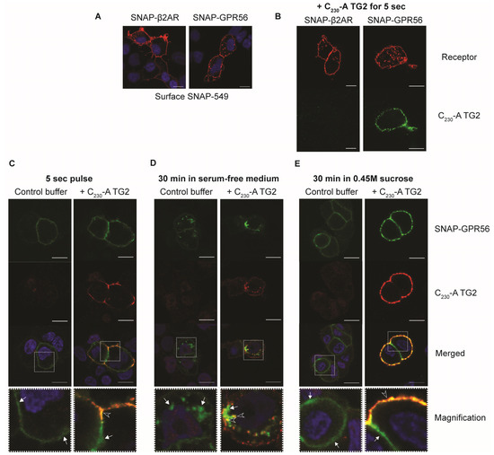 The SNAPf-tag coding sequence was amplified using pSNAPf-ADRβ2 control plasmid with primers: 5′ATAAGATCTAGCATGGACAAAGACTGCGAAATGAAG3′ and 5′ATATCTAGACTCGAGGGATCCTGGCGCGCCTATACCTGC3′. The PCR product was cloned into a modified pcDNA4/His encoding an N-terminal IgG signal sequence. GPR56 cDNA was then cloned in-frame with the IgG signal N-terminal SNAPf-tag in the pcDNA4/V5/His plasmid. SNAP-GPR56 cDNA was transfected, and cells covalently labelled with SNAP-surface Alexa Fluor 647-substrate (1 µM), at 4 °C for 15 min (48 h post-transfection). Cells were washed with serum-free advanced 0.5% BSA/DMEM prior to TG2 treatment (20 µg/mL) for 5 s. TG2 containing medium was removed, replaced with serum-free medium with or without 0.45 M sucrose. After 30 min cells were fixed with 4% paraformaldehyde/PBS, washed, permeabilised with 0.5% saponin and then washed and blocked with 1% BSA for 30 min. Cells were stained for TG2 using the CUB7402 and Alexa Fluor 594-conjugated anti-mouse antibody. Coverslips were mounted onto slides using 5 μL vecta shield containing DAPI. Images were acquired by confocal microscopy with a 63× objective using excitation at 543 and 633 nm, respectively. Three independent experiments were performed.