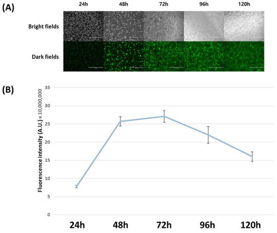 After the expression of EGFP, the expression level of the overexpression vectors was evaluated by comparing the fluorescence intensity. Before that, it was necessary to confirm when EGFP was most expressed in human embryonic kidney 293T (HEK293T) cells where the overexpression vector was transfected. HEK293T cells were transfected with an EGFP overexpression vector. To compare EGFP expression at each time point, fluorescence microscopy observations and fluorescence intensity measurements were performed at 24 h intervals up to 120 h. Under fluorescence microscopy, the expression of the fluorescent protein was observed approximately 24 h post-transfection, rapidly increasing after 48 h (Figure 2A). Cells were collected at each observation time point, and fluorescence intensity was measured using the expressed EGFP. The fluorescence intensity was highest at 72 h post-transfection and then decreased (Figure 2B). Accordingly, the optimal time point for comparative evaluation of the expression levels of overexpression vectors was determined to be 72 h post-transfection.