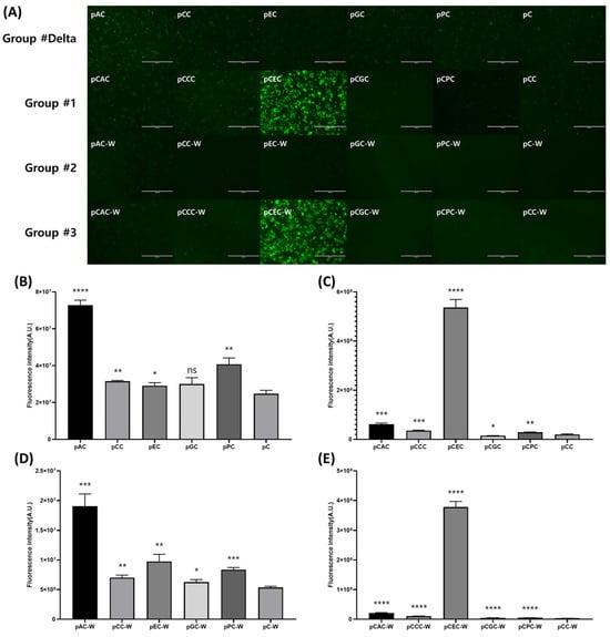 To systematically compare the performance of the twenty types of overexpression vectors distributed across the four groups through EGFP expression, the same amount of overexpression vector plasmid was transfected under the same conditions. Subsequently, observation using a fluorescence microscope and measurement of fluorescence intensity were performed. Fluorescence microscopy analysis revealed that in Group #delta, which lacked the CMV enhancer and WPRE, all vectors except pAC exhibited fluorescent protein expression patterns similar to those of the control pC vector. Group #1, with an additional CMV enhancer compared with group #delta, showed the strongest fluorescent protein expression with the pCEC vector, and the other vectors (pCAC, pCCC, pCGC, and pCPC) were similar to the control pCC. Group #2, with an additional WPRE compared with group #delta, showed fluorescent protein expression similar to that of control pC-W in all vectors, and none exhibited a noticeably high expression level like those in Group #1. Group #3, with an additional CMV enhancer and WPRE, showed the strongest fluorescent protein expression in the pCEC-W vector, and the other vectors (pCAC-W, pCCC-W, pCGC-W, and pCPC-W) were similar to the control pCC-W (Figure 3A). Fluorescence measurements were performed to quantitatively compare the expression intensities of the overexpression vectors (Figure 3B–E). The overexpression vectors (excluding pCGC in Group #1) across all groups consistently demonstrated higher expression intensity than the control vectors of each group (Figure 3B–E). In Group #delta, all overexpression vectors showed higher fluorescence intensity than the control pC. The expression level of EGFP was increased by an auxiliary promoter placed upstream of the CMV promoter. Among them, the pAC vector exhibited the highest expression level, approximately three times that of the control vector and twice that of the remaining overexpression vectors (Figure 3B). In Group #1, the pCEC vector displayed the highest expression level, approximately 27 times that of the control vector. The expression level of the human elongation factor 1-alpha (EF1-a) promoter was elevated by the CMV enhancer. Other additional promoters showed no effect or the expression level was slightly lowered (Figure 3C). In Group #2, the pAC-W vector exhibited the highest expression level, approximately three times that of the control vector. However, compared with Group #delta, all promoters exhibited reduced expression levels by WPRE. Among them, the human EF1-a promoter showed the least impact, and the rest were reduced five- to six-fold (Figure 3D). Finally, in Group #3, the level of pCEC-W vector expression was approximately 115 times stronger than that of the control vector. However, compared with Group #1, all promoters exhibited reduced expression levels by WPRE. Of these, the human EF1-a promoter showed the least impact, and the rest were reduced three- to six-fold (Figure 3E). Overexpression vectors exhibited significantly different expression levels of EGFP depending on the type of additional promoter or the presence or absence of CMV enhancer or WPRE (Figure 3). Among them, the pCEC and pCEC-W vectors, which showed significantly higher EGFP expression levels, are expected to facilitate the mass production of antigen proteins.