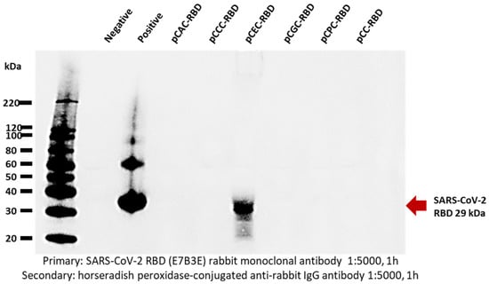 Expression levels of all overexpression vectors were assessed using EGFP. Among them, the pCEC vector showed a superior level of EGFP expression. Therefore, it was necessary to further verify that the pCEC vector also expresses antigenic proteins other than EGFP at a high level. The antigen protein was the severe acute respiratory syndrome coronavirus 2 (SARS-CoV-2) receptor-binding domain (RBD), and all vectors of Group #1, including the pCEC vector, were used. To create a recombinant overexpression vector that overexpressed the SARS-CoV-2 receptor-binding domain (RBD), six vectors in Group #1 were treated with the restriction enzymes EcoRI and EcoRV to remove the EGFP gene and facilitate the cloning of the SARS-CoV-2 RBD gene. The resulting SARS-CoV-2 RBD gene overexpression vectors produced by gene cloning were validated by DNA electrophoresis after treatment with specific restriction enzymes. To confirm the overexpression of the SARS-CoV-2 RBD protein, HEK293T cells were transfected with a recombinant overexpression vector. Seventy-two hours post-transfection, cells were collected, lysed with M-PER lysis buffer, and electrophoresed on a 4–20% gradient sodium dodecyl sulfate-polyacrylamide gel electrophoresis (SDS-PAGE) gel. The separated proteins were subsequently transferred to a polyvinylidene fluoride (PVDF) membrane and treated with an anti-RBD antibody specific to SARS-CoV-2 RBD. Western blotting images were captured using a chemiluminescence imaging system (ChemiDoc MP, Bio-Rad, Hercules, CA, USA). The outcomes revealed a strong signal corresponding to the approximately 29-kDa RBD protein only in the pCEC vector that exhibited the highest EGFP expression; expression could not be confirmed in the remaining vectors, including the control vector (Figure 4).