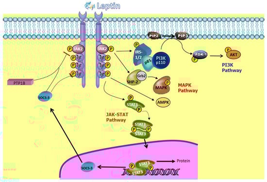 LepR belongs to the type I cytokine receptor family, and t has six subtypes obtained through splicing (ranging from LepRa to LepRf) []. Following LepR autophosphorylation, leptin signaling takes place, triggering the Janus kinase (JAK) tyrosine kinase pathways and the signal transducer and activator of transcription (STAT), insulin receptor substrate (IRS)/phosphatidylinositol 3-kinase (PI3K), mitogen-activated protein kinase (MAPK), extracellular signal-regulated kinase (ERK), and adenosine 5′-monophosphate-activated protein kinase (AMPK) pathways [,]. The activation of each of these pathways contributes to the anorexigenic effects of leptin (appetite suppression, weight loss stimulation, and increased thermogenesis) [,,].