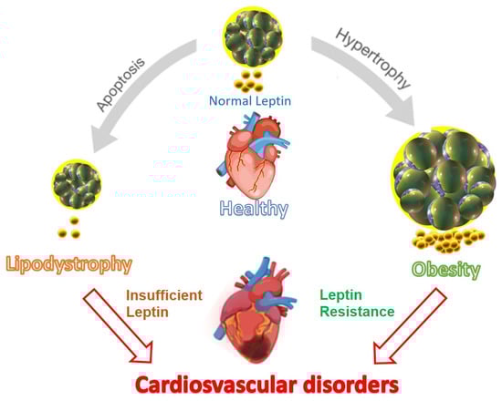 Paradoxical effect of leptin: relationship between circulating leptin levels and cardiovascular dysfunction. For proper cardiovascular function, it is essential to maintain circulating leptin levels within a narrow normal range. In conditions of lipodystrophy, resulting from widespread adipose tissue apoptosis or the inability to develop adipose tissue correctly, extremely low levels of circulating leptin promote cardiovascular disorder. Conversely, in diet-induced obesity, hyperleptinemia acts as an important factor in developing cardiovascular dysfunction due to leptin resistance (modified from reference []).