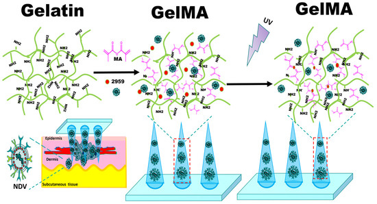 In summary, we designed GelMA hydrogel microneedles that can be used for oncolytic NDV delivery, which has recently attracted increasing research attention in tumor immunotherapy. Strategies which have been shown to improve the delivery efficiency of the oncolytic NDV include PEGylated virus shells [28], polymer-coated viruses [29,30], biomineralized nanoparticles encapsulating oncolytic viruses [31], and drug delivery vehicles such as hydrogels [11,13,32,33,34,35]. However, because the biological activity of the oncolytic NDV is not easy to maintain in vitro, its drug delivery efficiency is generally low, and it is difficult to maintain the therapeutic dose of tumor tissue. To improve the efficacy of oncolytic NDV in cancer treatment, large doses, and repeated injections are required, which are associated with inconvenience and risks to patients. Therefore, it is important to develop a controllable delivery system that can maintain the biological activity of the oncolytic NDV and also target and continuously release the oncolytic NDV into tumor tissues.