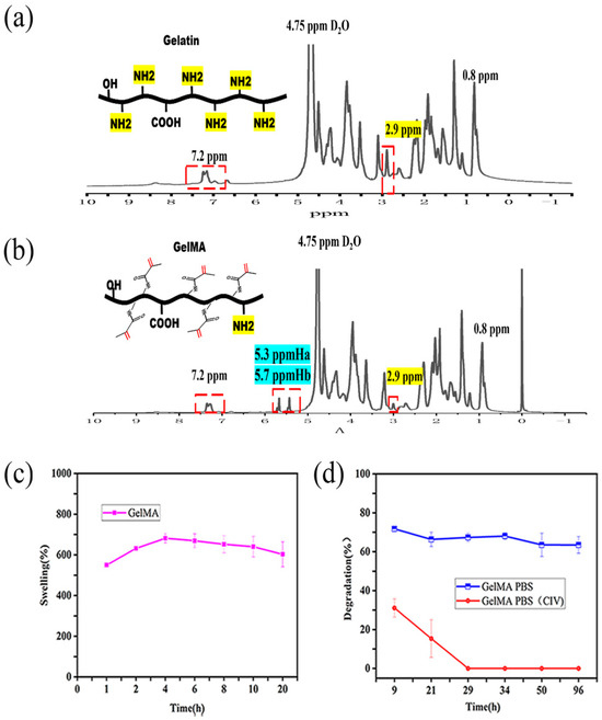 Characterization diagram of GelMA. (a) The NMR-H1 of gelatin. (b) The NMR-H1 of GelMA. (c) The swelling curve of GelMA in PBS. (d) The degradation curve of GelMA in PBS and PBS containing collagenase.