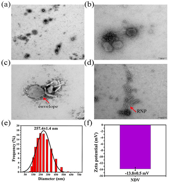 Characterization diagram of NDV. (a) The dispersion degree of NDV in the allantoic fluid, taken by scanning electron microscopy (scale bar 500 nm). (b) The morphology of NDV, taken by scanning electron microscopy (scale bar 200 nm). (c) The characteristic envelope of NDV, taken by scanning electron microscopy (scale bar 200 nm). (d) The aggregated ribonucleoprotein (RNP) of NDV, taken by scanning electron microscopy (scale bar 200 nm). (e) The particle size distribution of NDV. (f) The zeta potential diagram of NDV.