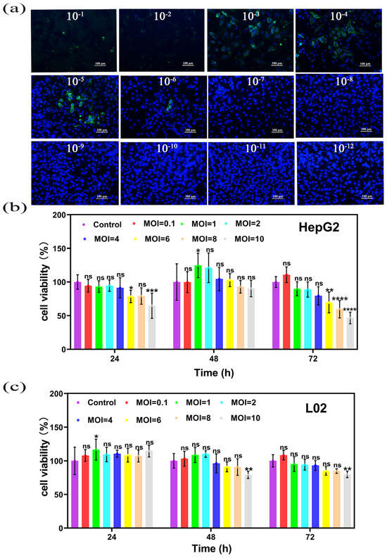 (a) The immunofluorescence diagram of TCID50 determination of NDV, with a scale of 100 nm. (b) The cell survival rate of HepG2 cells at 24 h, 48 h and 72 h after NDV treatment. (c) The cell survival rate of L02 cells at 24 h, 48 h and 72 h after NDV treatment. Data were shown as mean ± SD (n = 3) and analyzed using the one-way ANOVA test. Significances were presented by * p < 0.05, ** p < 0.01, *** p < 0.001, **** p < 0.0001, ns: not significant.