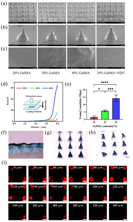 The GelMA microneedles encapsulating NDV were prepared by drying at 37 °C for 12 h. Figure 5 shows the stress–strain curves of GelMA microneedles containing 20%, 30% and 40% GelMA from right to left, respectively. With the increase in GelMA content, the stress–strain curve gradually shifted to the left and, under the same stress, the strain gradually decreased (Figure 5d) and Young’s modulus gradually increased (Figure 5e), indicating a gradual increase in mechanical strength.